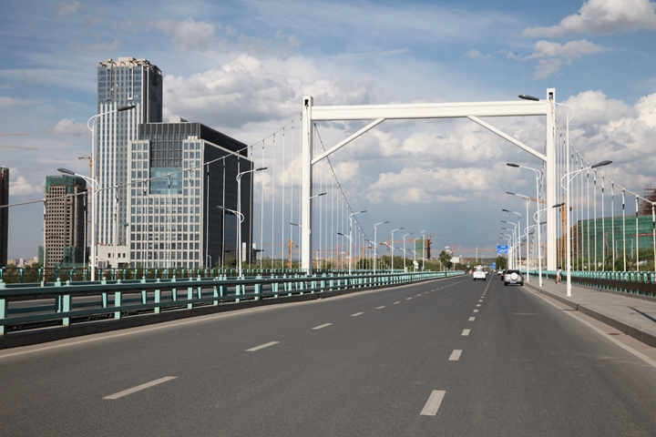 工程規(guī)模:烏魯木齊經濟技術開發(fā)區(qū)北一路橋梁為分離式雙向六車道,全長276米,橋寬34米,共四跨一聯(lián),橋梁外觀裝飾為單塔雙索懸索橋。