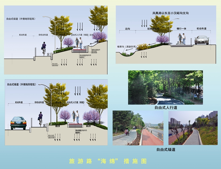 奧體西路南延原為斷頭路,道路紅線范圍及東西側(cè)空間原狀均為荒地,旅游路北橋北側(cè)原為大辛河支溝上游河道。結(jié)合本次奧體西路南延道路工程建設(shè),充分落實(shí)海綿城市建設(shè)理念,重點(diǎn)對(duì)橋下空間因地制宜進(jìn)行挖潛,精心設(shè)計(jì)建設(shè)了1500余平方的生態(tài)水塘、植草溝、旱溪等海綿工程設(shè)施。通過對(duì)旅游路部分路段雨水進(jìn)行斷接,使上游區(qū)域雨水先進(jìn)入生態(tài)水塘等設(shè)施進(jìn)行生態(tài)凈化和下滲,滲后多余的雨水再溢流進(jìn)入大辛河支溝,徹底改變了該路段原有的雨水直排模式。