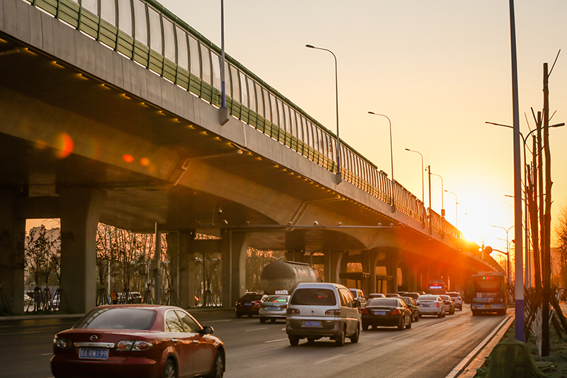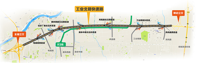 工業(yè)北路快速路西起全福立交橋,東至郭店立交,長13.6公里,標準段寬25.5米,雙向6車道。沿線共設(shè)置8對匝道,其中7對實現(xiàn)高架橋梁與地面道路的連接,在郭店立交設(shè)置一對專用匝道實現(xiàn)高快轉(zhuǎn)換。